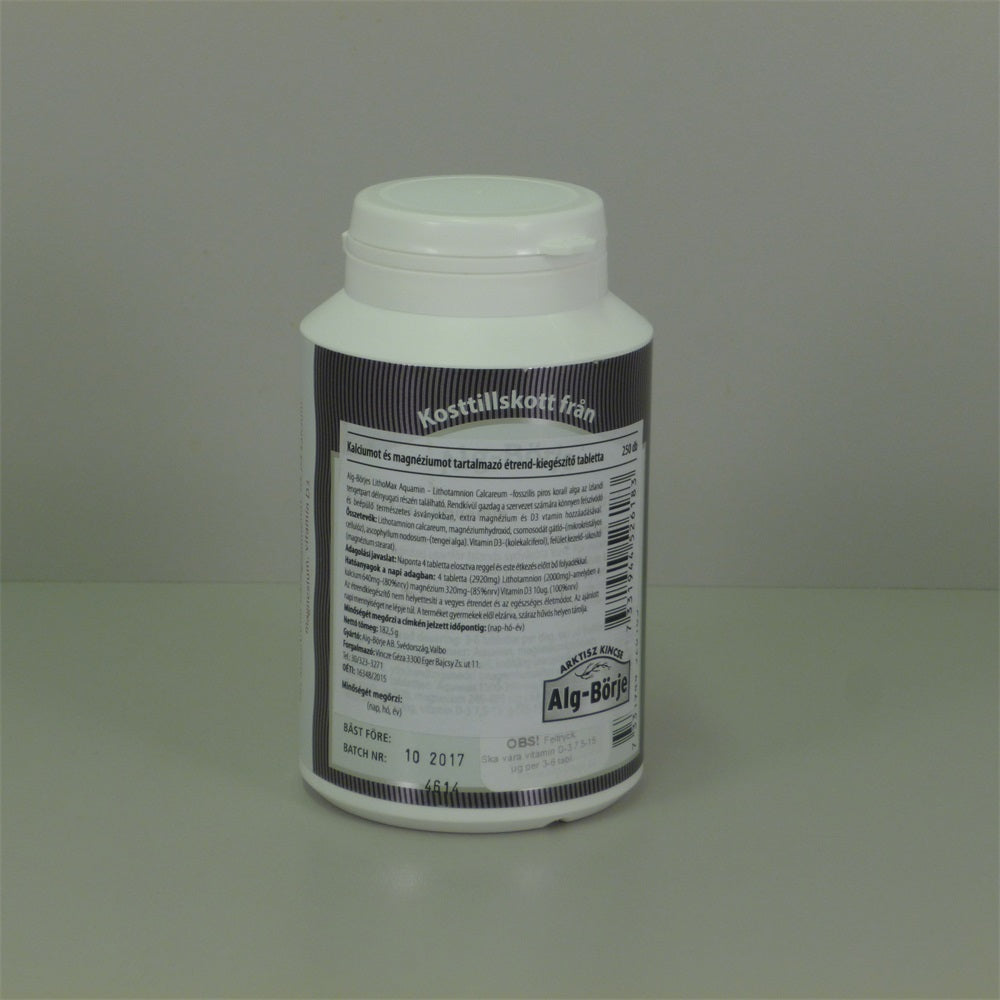 Lithotamnion Calcareum (Islandská fosílna červená koralová riasa) prášok. Obsahuje prirodzený vápnik, horčík, železo a ďalších 74 druhov prírodných minerálov. Obohatené o extra horčík a vitamín D3.