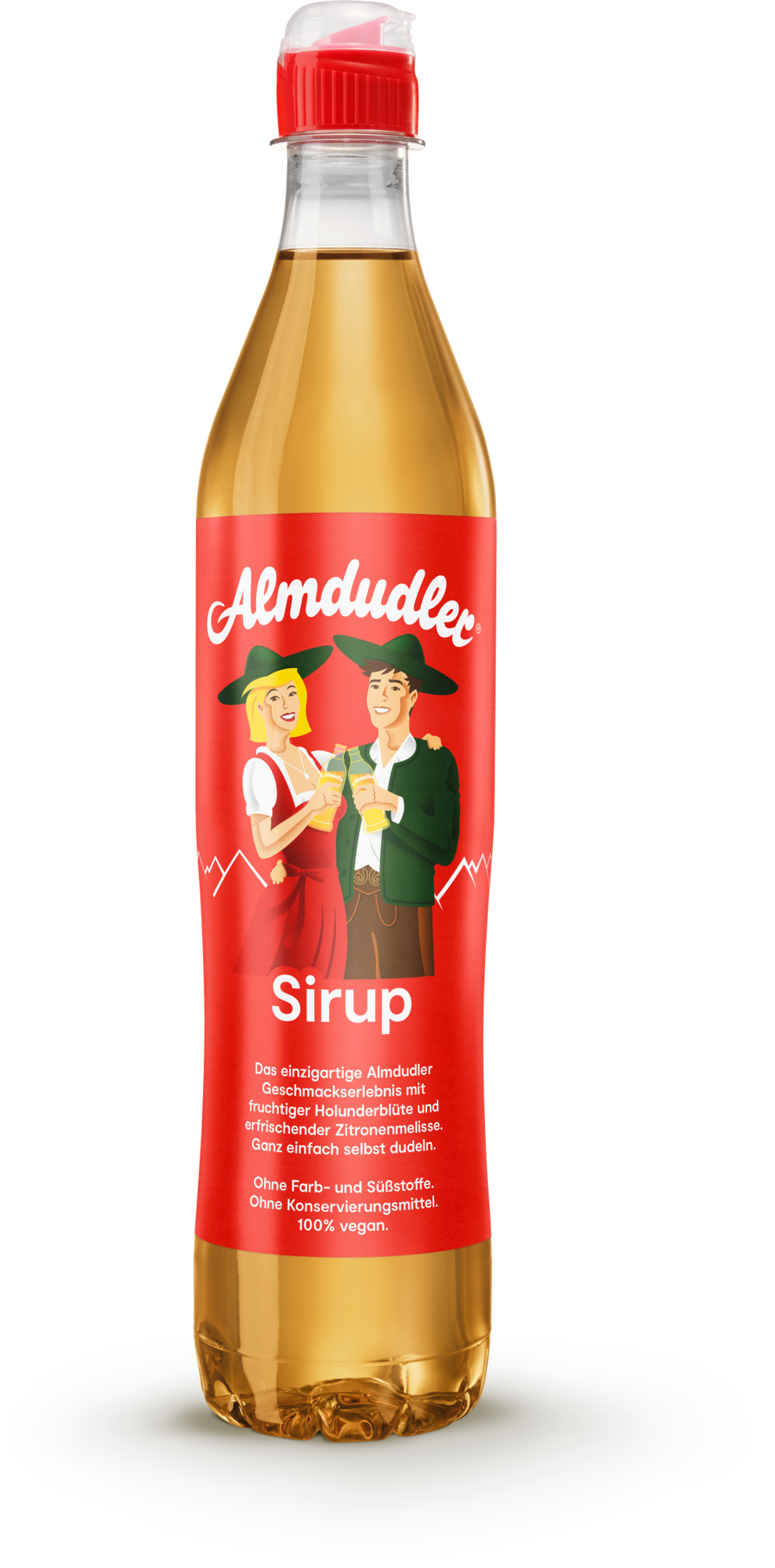 Almdudler sirup, ktorý sa ľahko pripravuje, je bez farbív, konzervačných látok, sladidiel a je 100% vegánsky.