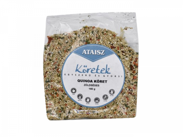 Biela quinoa, sušená zelenina 10%, v rôznom pomere (mrkva, koreň a vňať petržlenu, paradajkové vločky, červená cibuľa).
