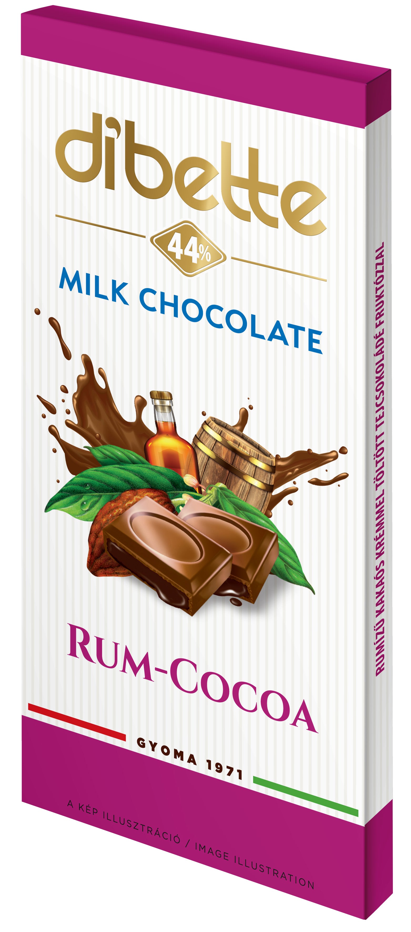 Mliečna čokoláda 65% (fruktóza (23%), kakaové maslo, kakaová hmota, mliečna bielkovina, plnotučné sušené mlieko, mliečny tuk, emulgátory: sójový lecitín, polyglycerolpolyricinoleát, aróma), kakaový krém s rumovou príchuťou 35% (nehudrogenovaný rastlinný tuk (palma, shea), fruktóza (12%), sójová múka, nízkotučný kakaový prášok (3%), mliečna bielkovina, plnotučné sušené mlieko, aróma, emulgátor: sójový lecitín).