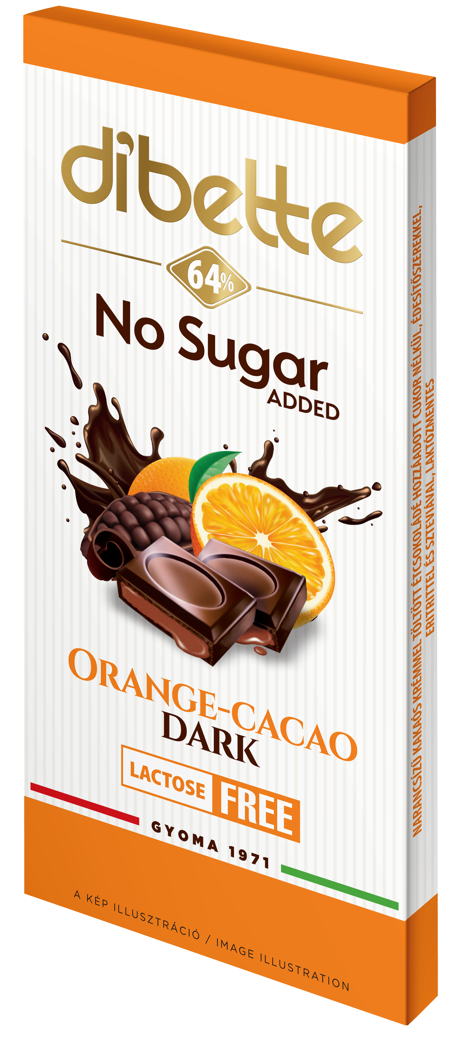 horká čokoláda 65% (kakaová hmota, sladidlá: erytritol, glykozidy steviolu (0,02%), kakaové maslo, emulgátory: slnečnicový lecitín, polyglycerín-polyricínoleát, aróma), kakaový krém s pomarančovou príchuťou 35% (nehydrogenovaný rastlinný tuk (palmový, bambucké maslo), sladidlo: erytritol, sušené kokosové mlieko, sójová múka, nízkotučný kakaový prášok (1,5 %), potravinárska kyselina: kyselina citrónová, emulgátor: slnečnicový lecitín, aróma).