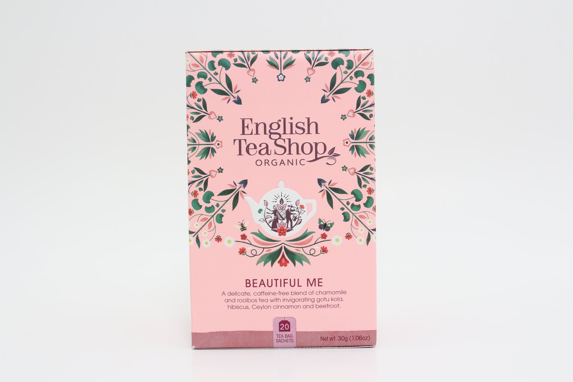 Harmanček* 22,5 %, gotu kola (pupkovník ázijský)* 21 %, ibištek* 16 %, škorica* 13 %, rooibos* 9 %, kakao* 9 %, pomarančová kôra* 5 %, červená repa* 3 %, brusnicová šťava* 1 %, okvetné lístky ruže* 0,5 %. *Z certifikovaného ekologického poľnohospodárstva.