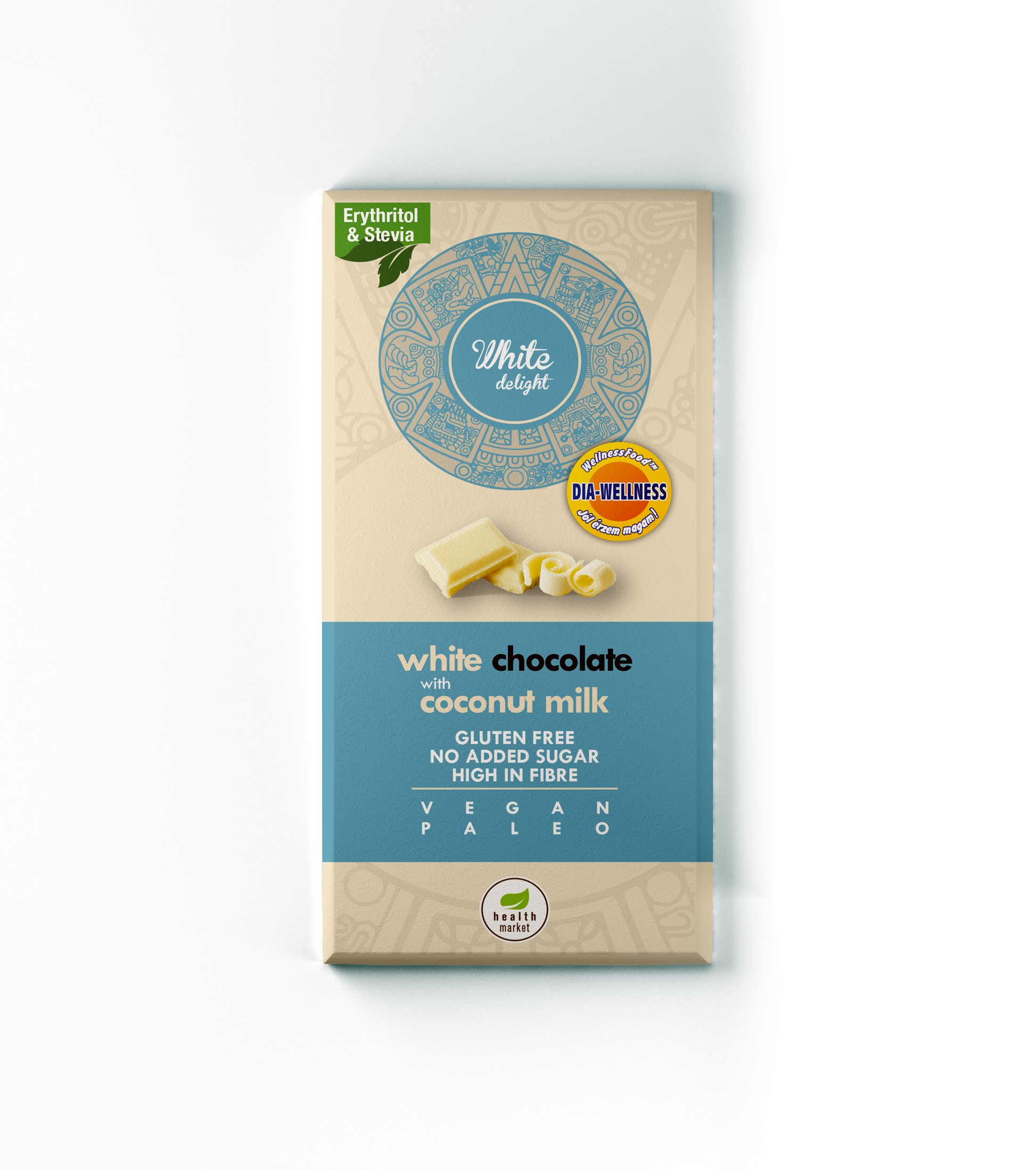 kakaové maslo 42%, kokosové sušené mlieko 25%, sladidlo: erytritol (18%), vlákniny (inulín, polydextróza), tapiokový škrob, emulgátor (slnečnicový lecitín), aróma, glykozidy steviolu (70mg/kg).