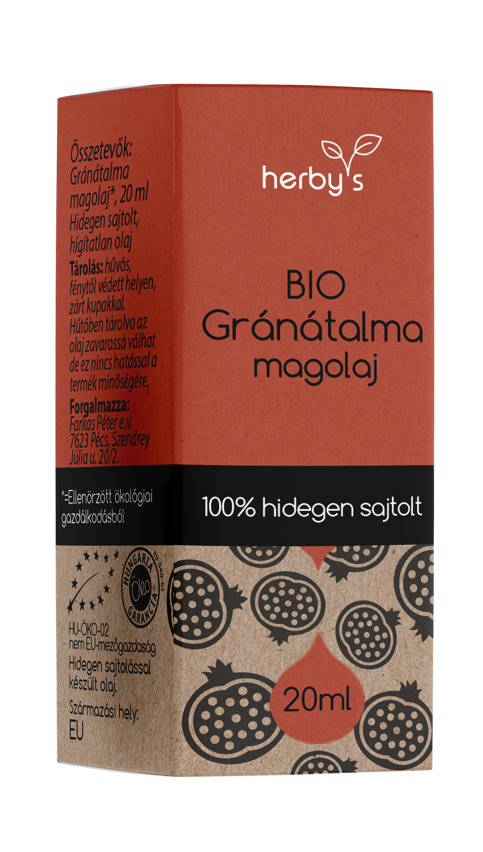 Zloženie: 100% čistý, za studena lisovaný BIO olej z granátového jablka. Bohatý na antioxidanty, nenasýtené mastné kyseliny a vitamíny A, B1, B2, C, E, K. Obsahuje aj minerály (fosfor, vápnik, draslík, železo) a fytoestrogény.
