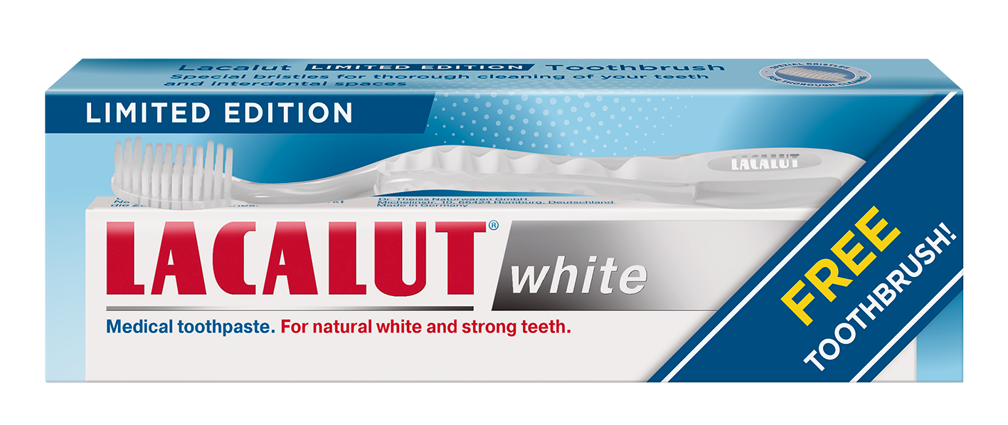 Pre prirodzene biele a silné zuby. Šetrne čistiace látky prispievajú k zachovaniu prirodzenej bielosti zubov bez poškodenia zubnej skloviny. + Lacalut LIMITED EDITION zubná kefka Fluorid sodný prispieva k spevneniu zubov a prevencii zubného kazu.