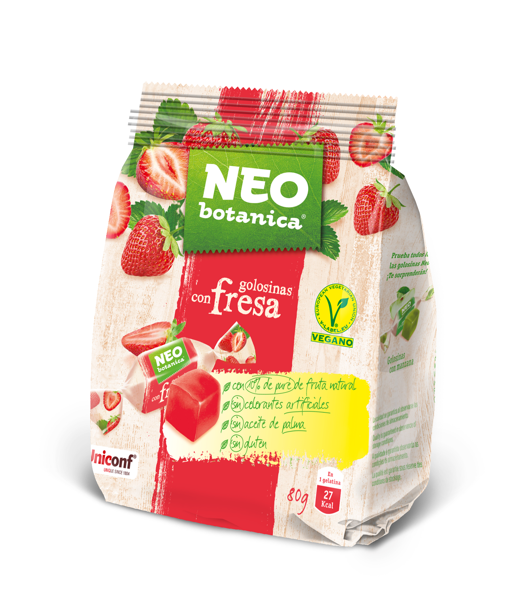 Vegánska a bezlepková, bez palmového oleja, bez umelých farbív a konzervačných látok. Mäkká, želatínová textúra, jednotlivo balené želé cukríky s pravým jahodovým pyré.