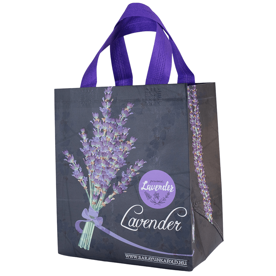 Malá tmavá ekologická taška s levanduľovými kvetmi.