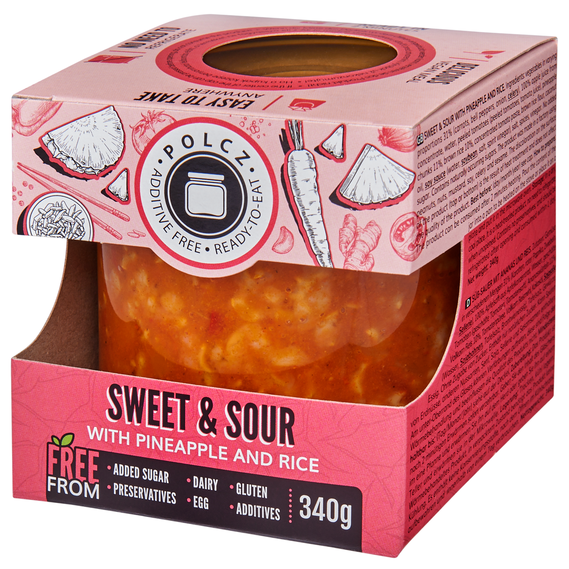 zelenina v premenlivom pomere 31% (mrkva, paprika, cibuľa, zeler), 100% jablková šťava z koncentrátu, pitná voda, lúpané paradajky (lúpané paradajky, paradajková šťava), kocky ananásu 11%, hnedá ryža 10%, paradajkový pretlak, múka z hnedej ryže, kokosový olej, sójová omáčka (pitná voda, sójové bôby, jedlá soľ, ocot z fermentovaného alkoholu), jedlá soľ, koreniny, ocot.