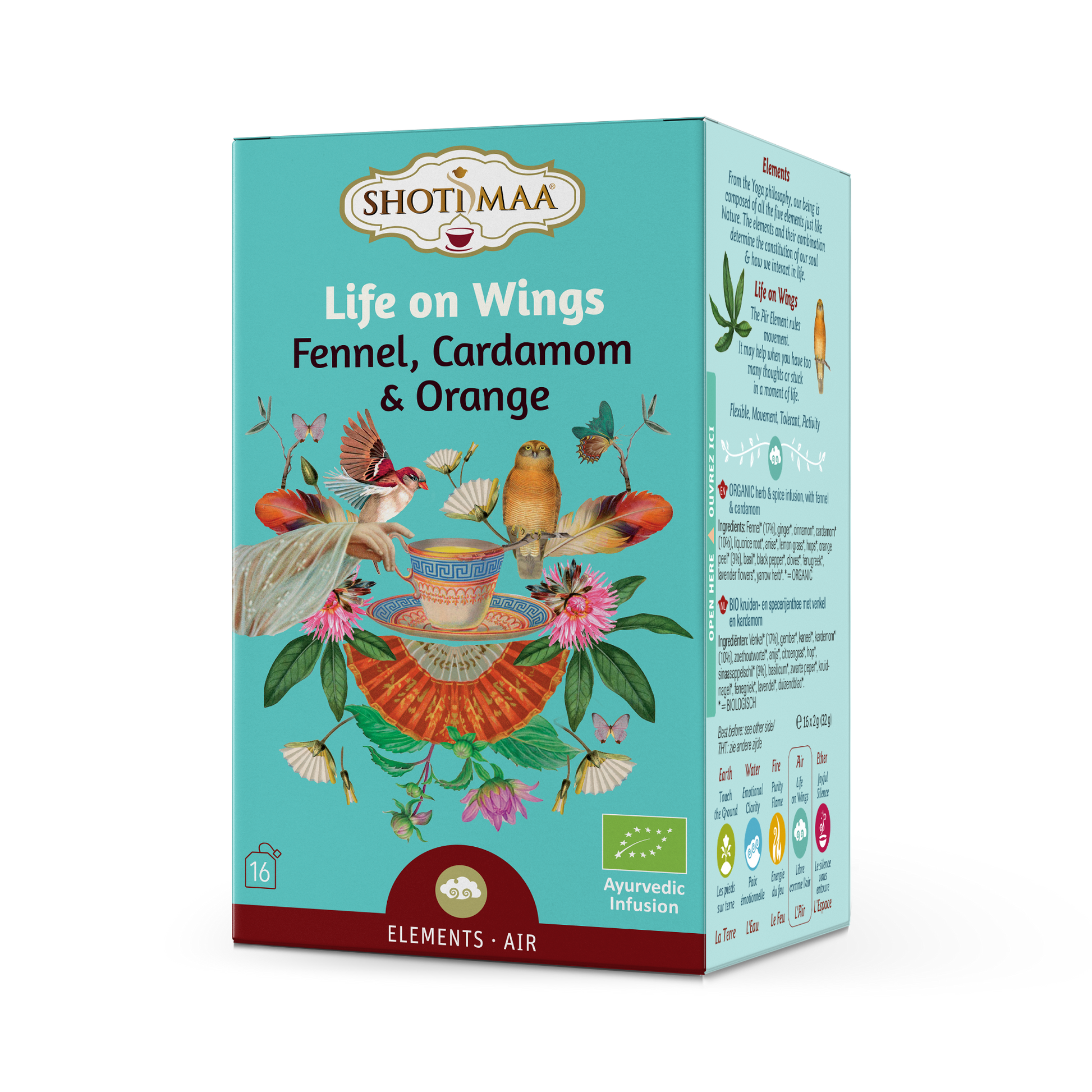 Fenikel* (17%), zázvor*, škorica*, kardamóm* (10%), koreň sladkého drievka*, aníz*, citrónová tráva*, chmeľ*, pomarančová kôra* (3%), bazalka*, čierne korenie*, klinčeky*, senovka grécka*, levanduľa*, rebríček*. * = Ekologické poľnohospodárstvo.