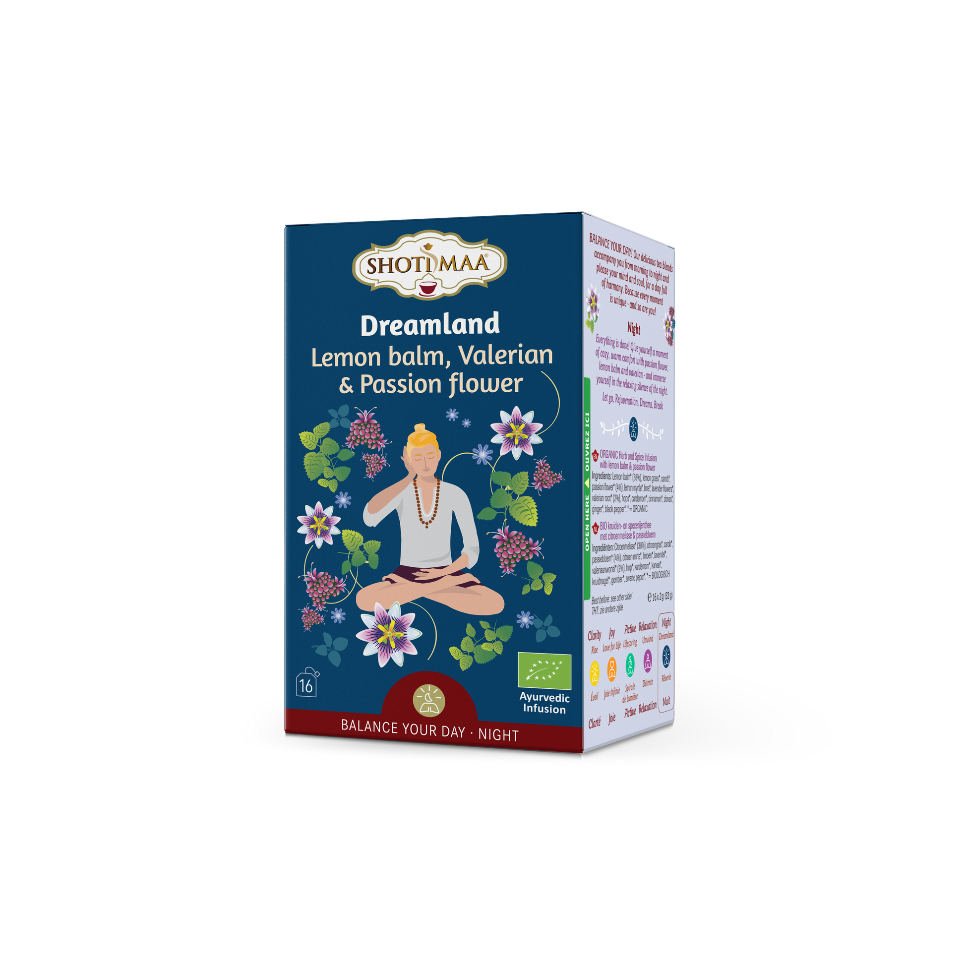 Medovka lekárska* (38%), citrónová tráva*, rohovník*, mučenka* (4%), citrónová myrta*, limetka*, kvety levandule*, koreň valeriány* (2%), chmeľ*, kardamóm*, škorica*, klinčeky*, zázvor*, čierne korenie*. * = BIO