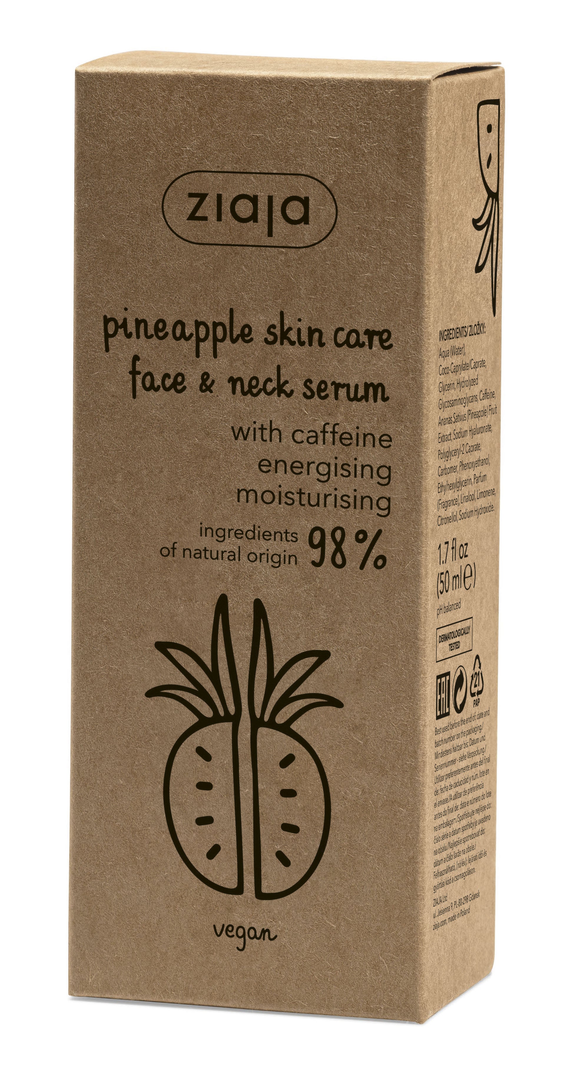 Zloženie: Aqua (Voda), Coco-Caprylate/Caprate, Glycerín, Hydrolyzované glykozaminoglykány, Kofeín, Extrakt z plodov Ananas Sativus (ananás), Hyaluronát sodný, Polyglyceryl-2 Caprate, Karbomér, Fenoxyetanol, Etylhexylglycerín, Parfum (Vôňa), Linalool, Limonén, Citronellol, Hydroxid sodný.